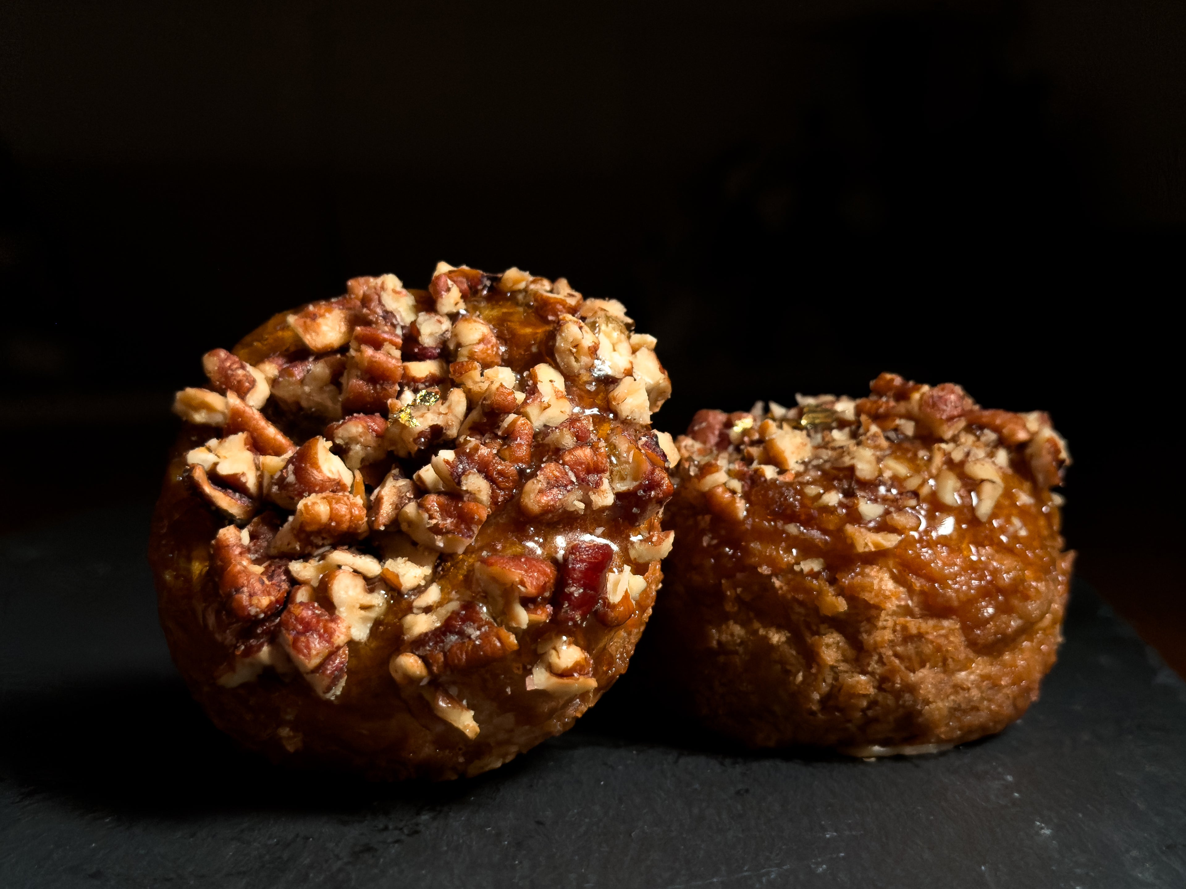 Madagascar vanilla diplomat cream with salted caramel cremeux, finished with a shiny caramel shell, generously coated with our homemade salted brown butter pecan nut crunch.